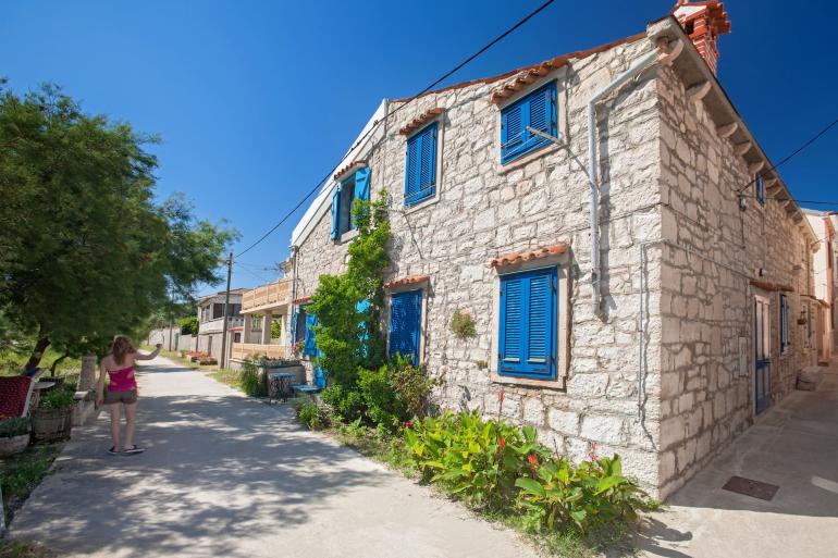 Beautiful Mediterranean white stone house with blue windows and doors in Susak