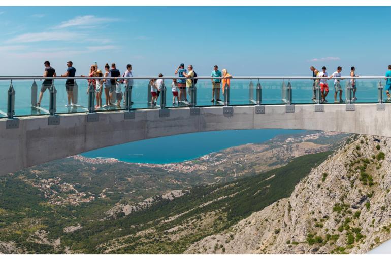 Skywalk Biokovo is a horseshoe-shaped platform out off the cliff with a glass walkway. It is located in the southwestern part of the Biokovo Nature Park